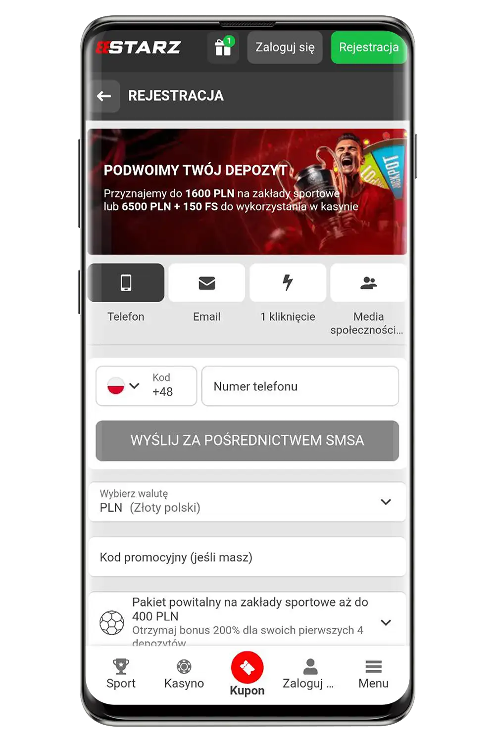 3. Wybierz metodę rejestracji: przez e-mail, telefon lub sieci społecznościowe.