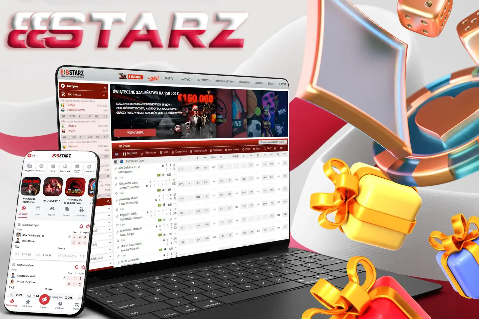 Platforma 888Starz Polska to jedyne w swoim rodzaju połączenie kasyna online i bukmachera, które zyskuje coraz większą popularność wśród graczy z całego świata. Serwis działa na licencji Curacao (8048/JAZ), gwarantując bezpieczne środowisko gier kasynowych i zakładów sportowych. Obsługuje wiele języków, w tym polski, co ułatwia korzystanie ze wszystkich funkcji platformy. Nasza recenzja 888Starz rzuca światło na wszystkie elementy oferty serwisu. Na polskich fanów hazardu online czeka tutaj ponad 7000 gier, w tym sloty, gry stołowe i karciane, a także kasyna na żywo. Do tego dochodzą setki rynków bukmacherskich z zakładami przedmeczowymi oraz live. Poznaj aktualne 888Starz opinie ekspertów, dołącz do gry i odbierz bonus powitalny!